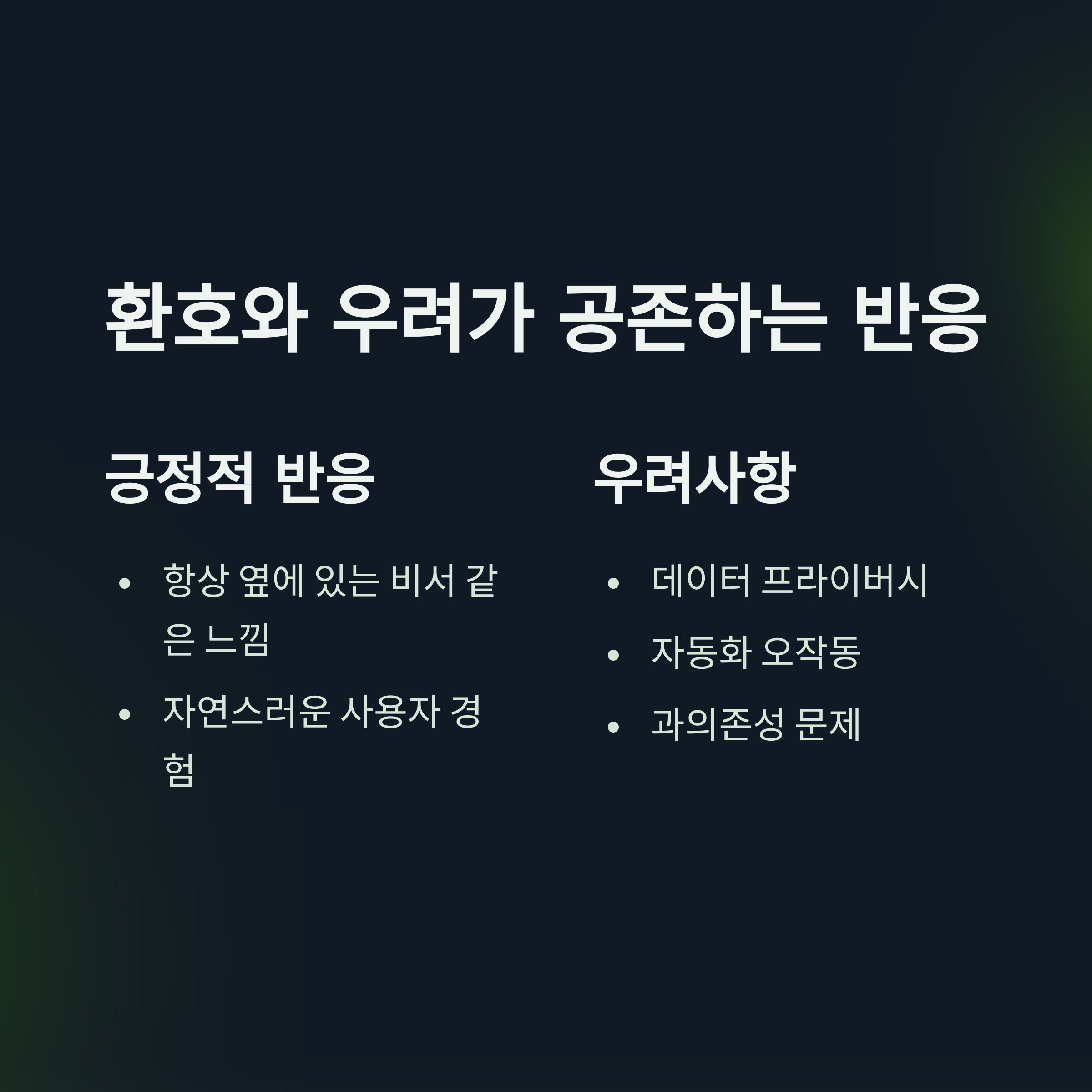 데이터 프라이버시, 자동화 오작동, 과의존성 우려도 동시에 제기되고 있습니다