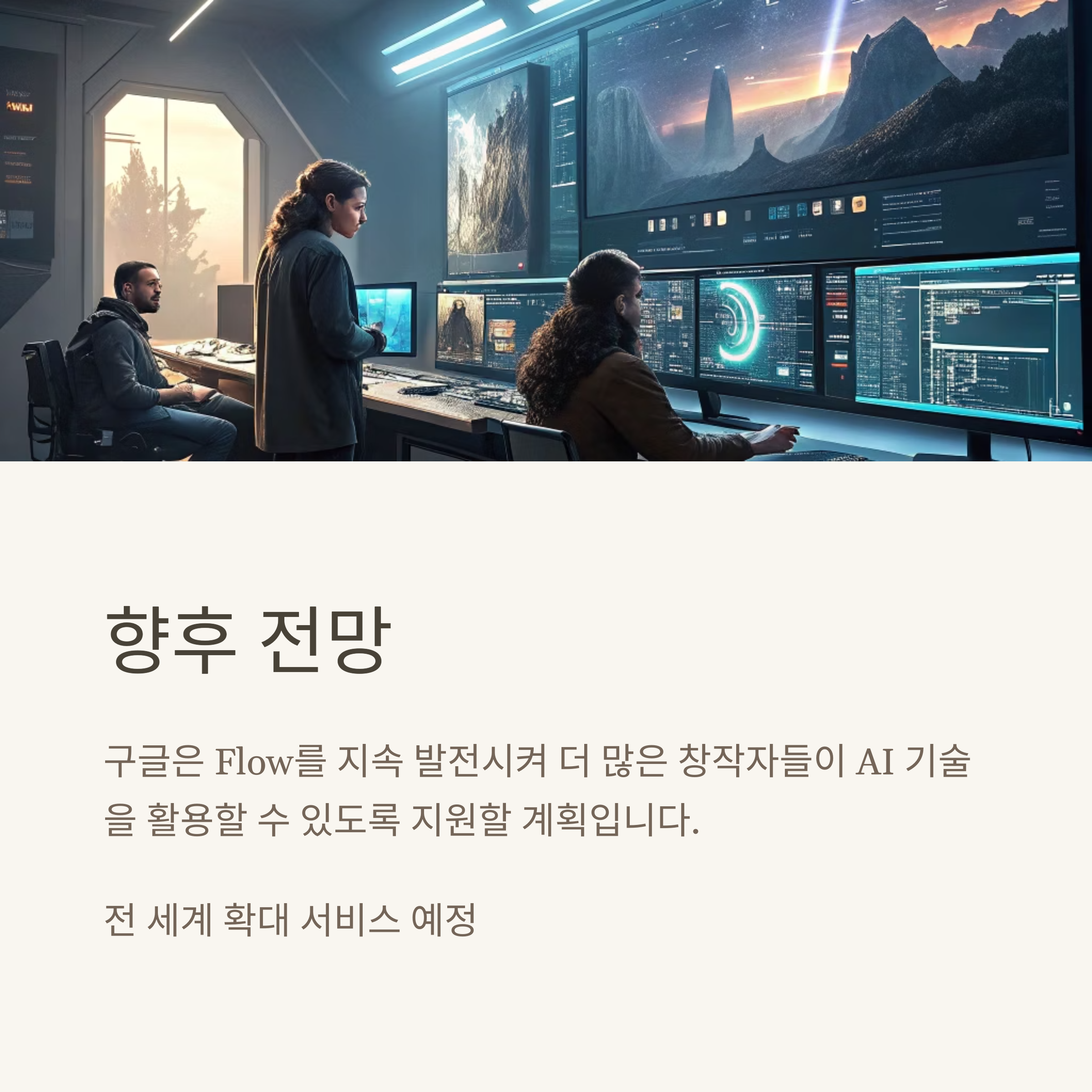 구글은 Flow를 지속적으로 발전시켜, 더 많은 창작자들이 AI 기술을 활용하여 창의적인 콘텐츠를 제작할 수 있도록 지원할 계획입니다.
