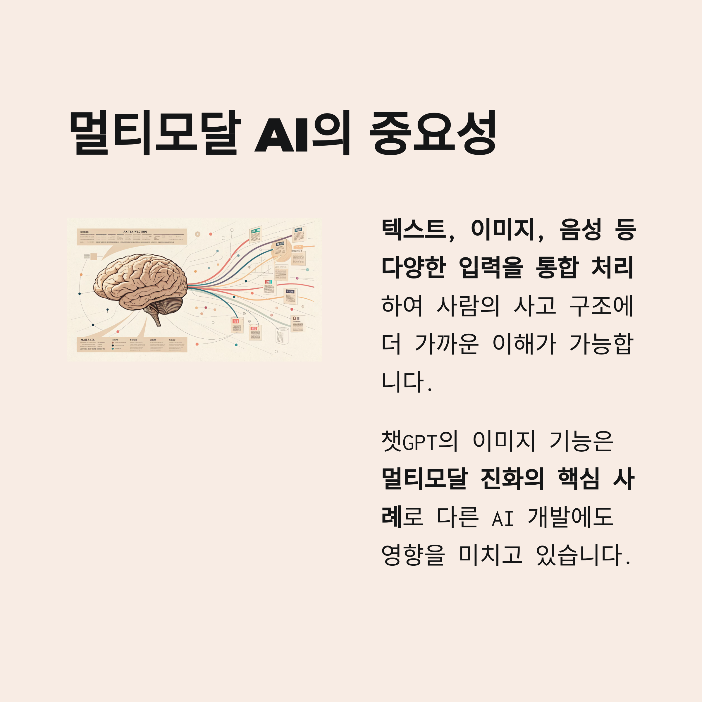 그러나 멀티모달 AI는 텍스트, 이미지, 음성 등 다양한 입력을 통합 처리하여