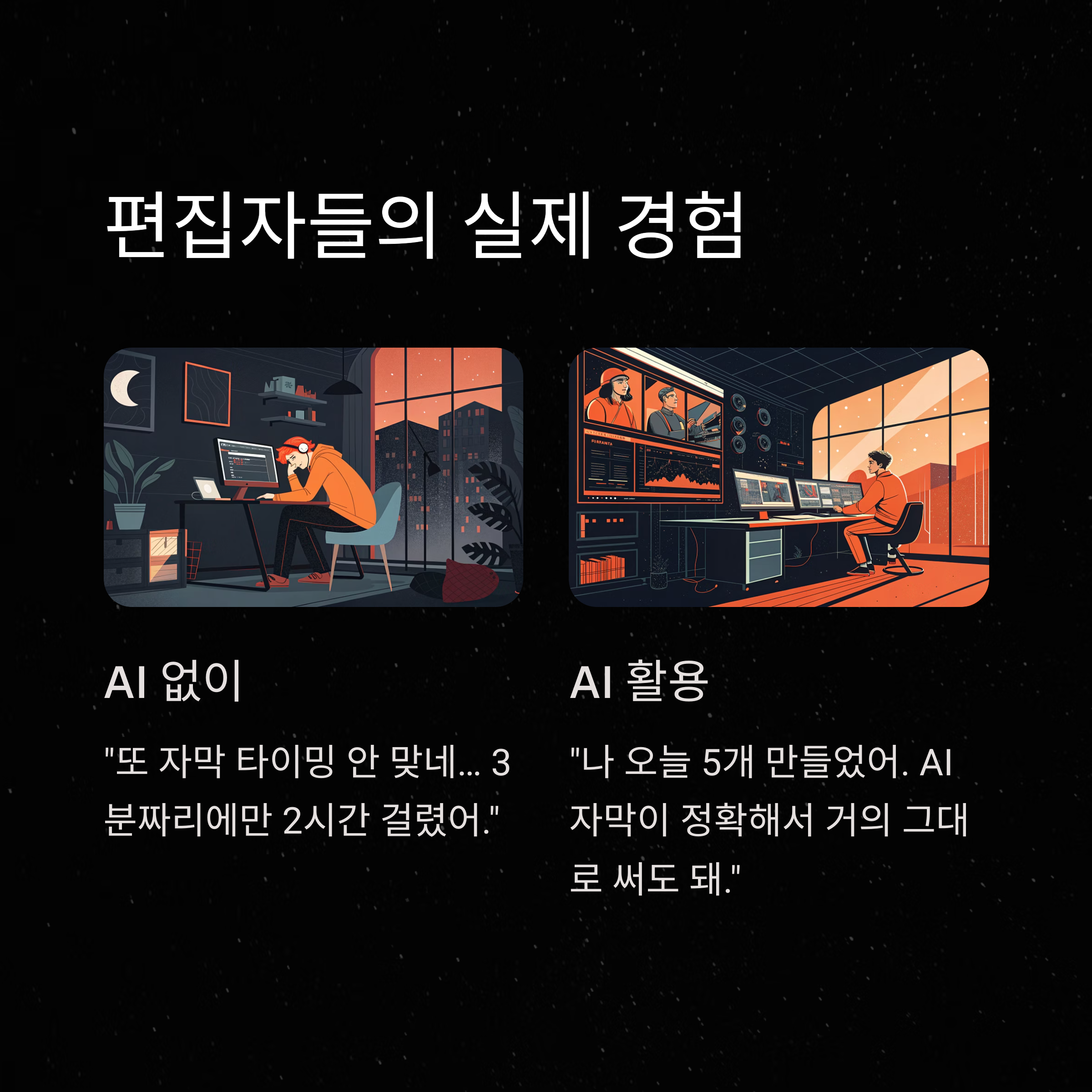 편집자 B: "또 자막 타이밍 안 맞네… 3분짜리에만 2시간 걸렸어."