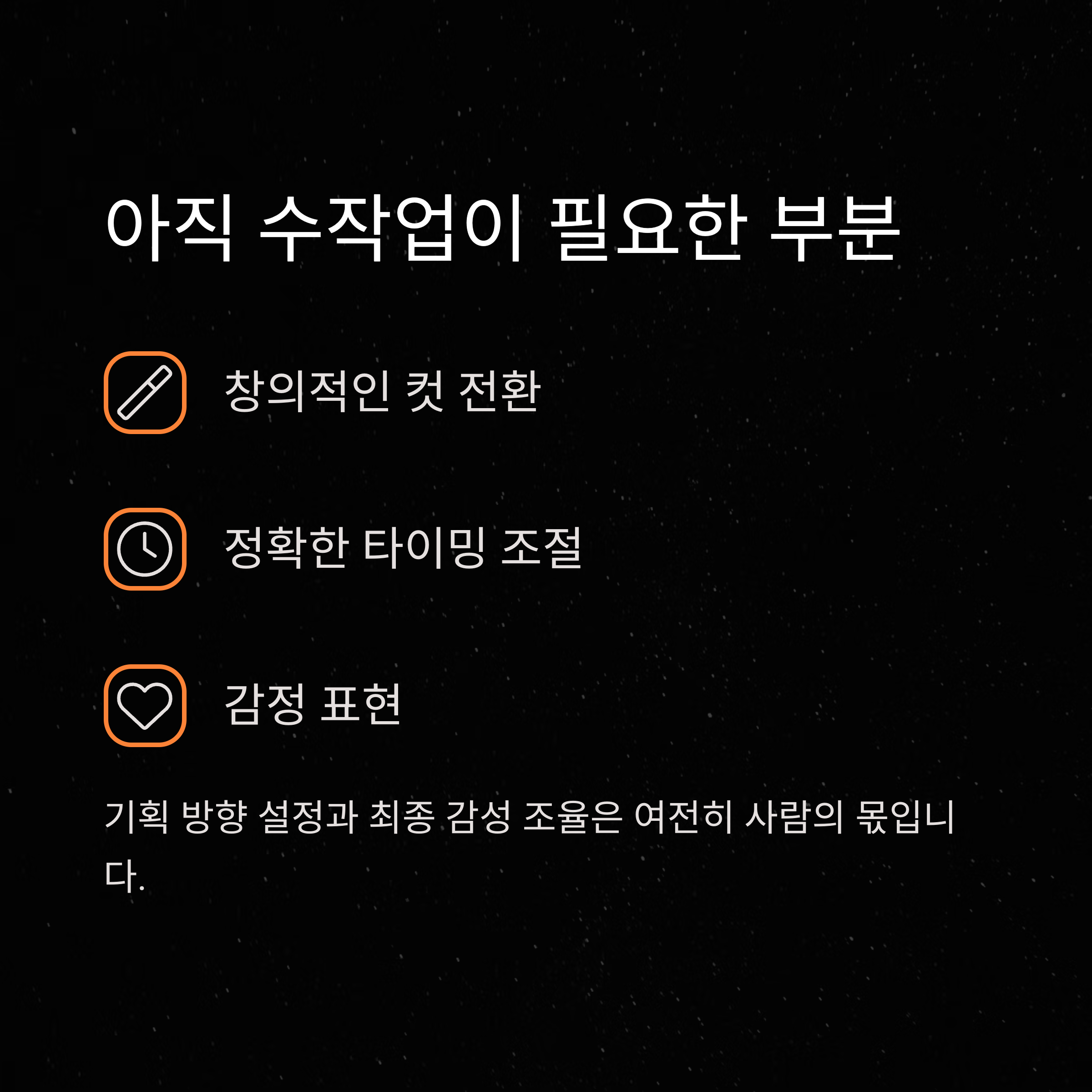 A: 영상의 기획 방향 설정, 최종 감성 조율, 음악과 텍스트 스타일 결정은 사람이 맡는 것이 좋습니다.