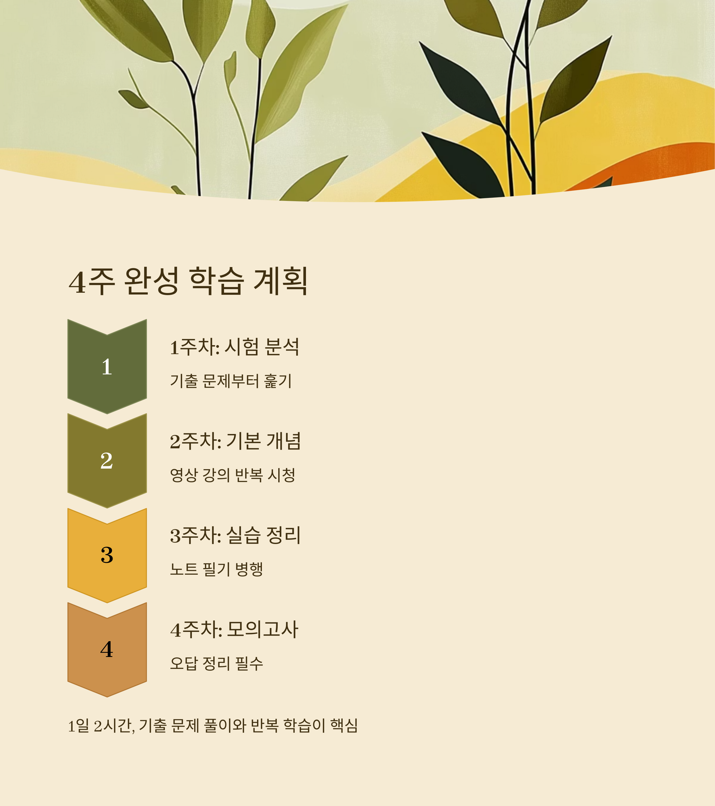 | 4주차 | 모의고사 풀기, 약점 보완 | 오답 정리 필수 |