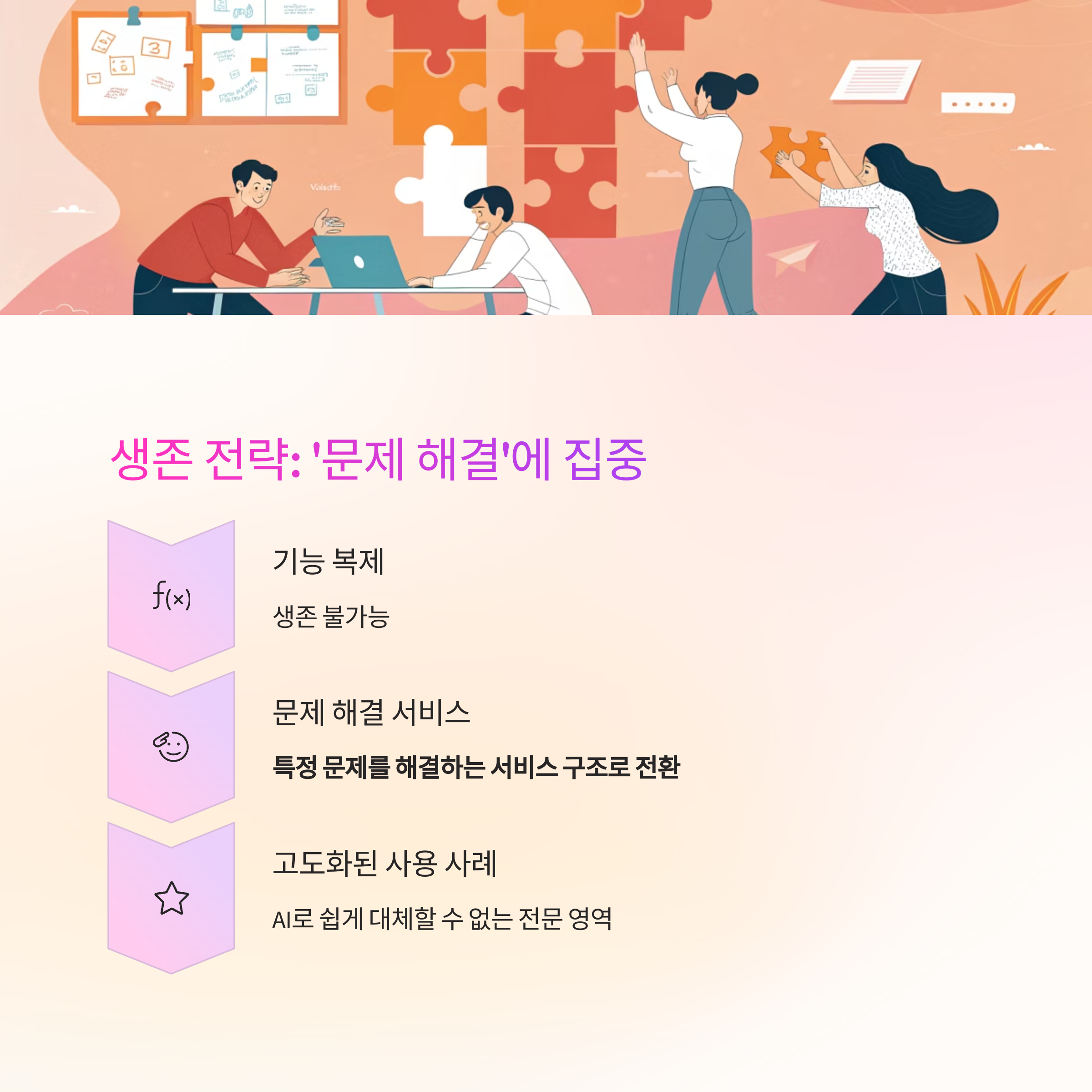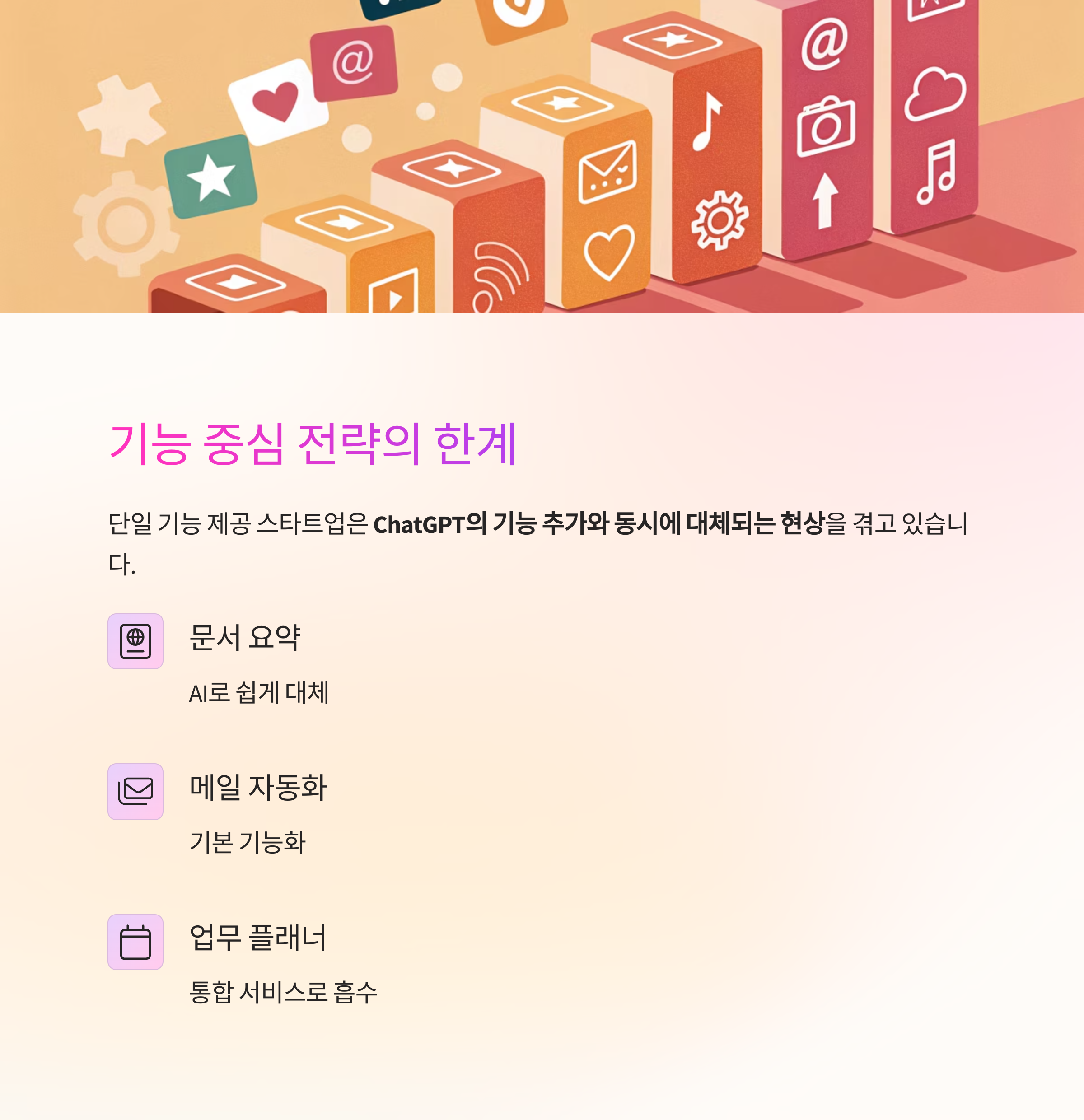 즉, 기능 자체에만 의존한 비즈니스 모델은 AI 통합 서비스의 확장 속도에 무너질 수밖에 없습니다.