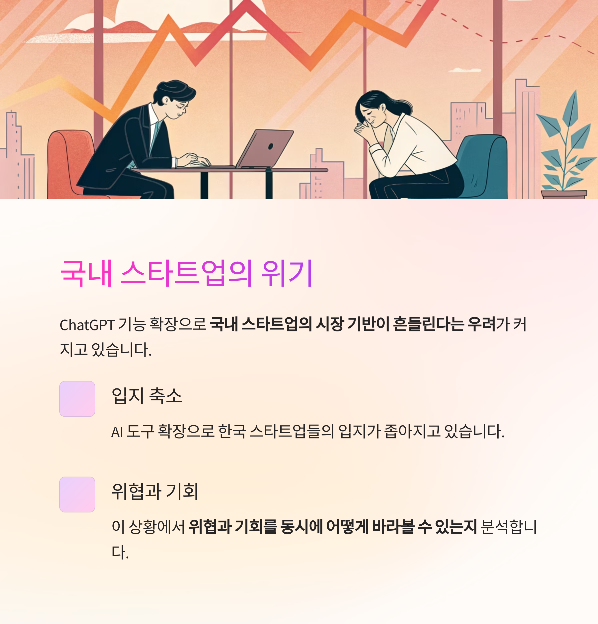 ChatGPT가 새 기능을 발표할 때마다 국내 스타트업의 시장 기반이 흔들린다는 우려가 커지고 있습니다.